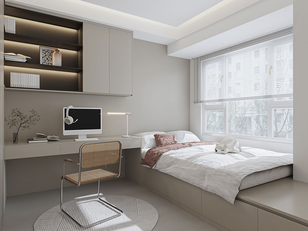 ??濟南阿達森裝飾為穎秀華府打造的現代極簡輕奢風。淺米色大尺寸沙發柔化空間,搭配焦糖棕單人椅,用撞色拉出層次感;黑白紋理茶幾與同質感背景墻呼應,高級又利落。深色木飾面 + 內嵌燈光的柜體,既做收納又成視覺焦點,懸浮式地臺延伸出松弛的休閑區,墻面藝術畫則添了藝術張力。整體以低飽和色調鋪底,通過材質對比平衡精致與舒適,剛好契合穎秀華府高端社區的品質調性,把都市大宅的松弛感穩穩拿捏。