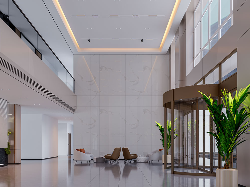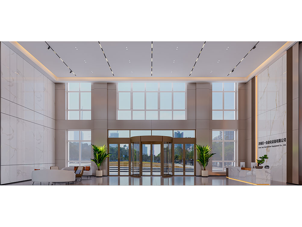 作為濟南辦公室裝修中企業形象型空間的代表,巨一自動化大堂以大理石飾面 + 金屬線條打造輕奢質感:挑高空間搭配嵌入式燈光,強化大氣氛圍;弧形旋轉門與綠植點綴柔化冷硬,前臺與品牌墻的一體化設計精準傳遞企業形象,契合濟南辦公室裝修商務展示接待功能的核心需求,是濟南工業企業辦公空間的高端范本。